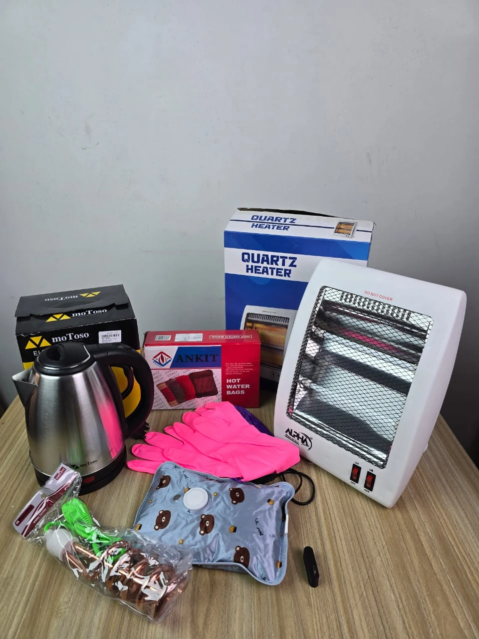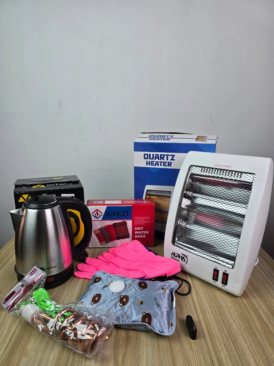 5-in-1 Winter Essential Combo: Quartz Heater, Electric Kettle, Immersion Rod, Hot Water Bag, and Gloves
