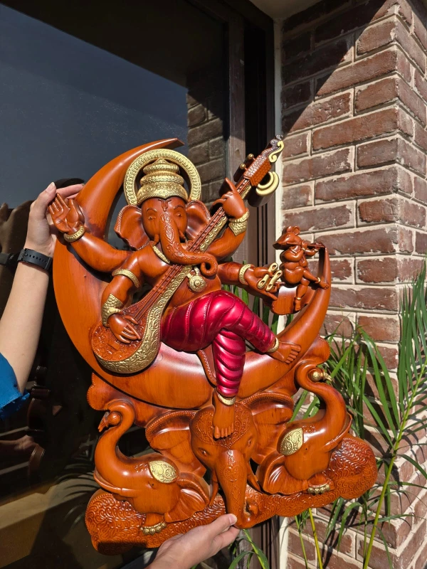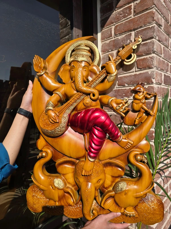 - Posture: Ganesha is depicted seated gracefully in a musical pose (veena-dhara), playing the veena, a traditional Indian string instrument.