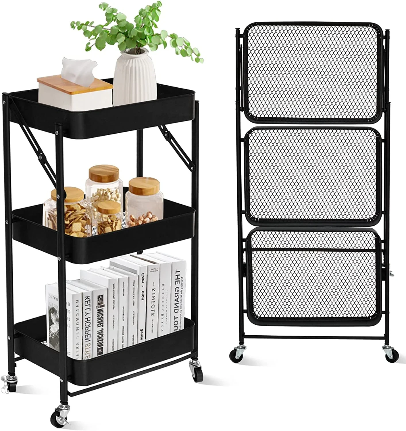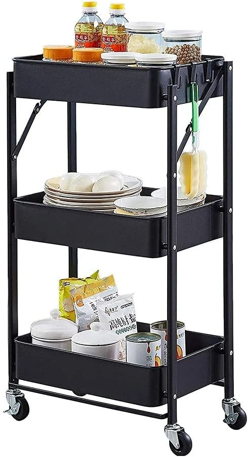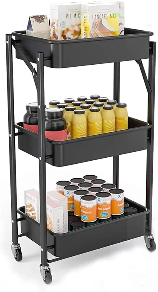 SKY-TOUCH 3-Tier Foldable Metal Rolling Utility Cart Organizer