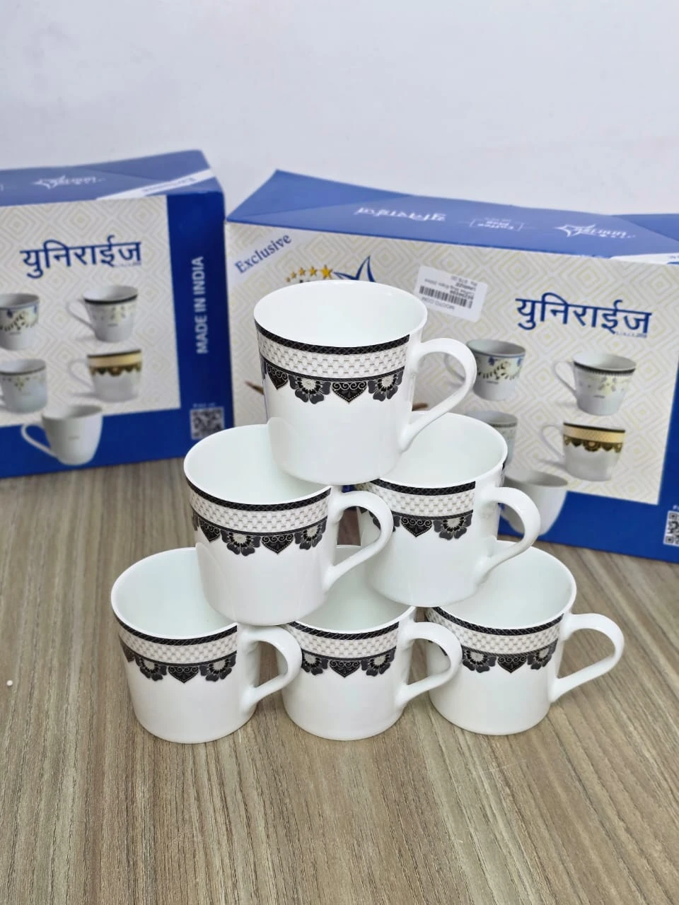 Unirize Exclusive Bone China/Ceramic Tea & Coffee Mug Set (Set of 6, White with Black & Silver Design)